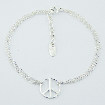 Two lengths of beautiful curb chain form this shiny plain Sterling Silver bracelet. Each length of chain wraps around the frame of a Silver peace charm uniting again at the links of a silver spring clasp. There is an extra 3 cm of chain dangling from one side of the spring clasp for the user to adjust the length of the bracelet. (Diameter of peace charm 13 mm).