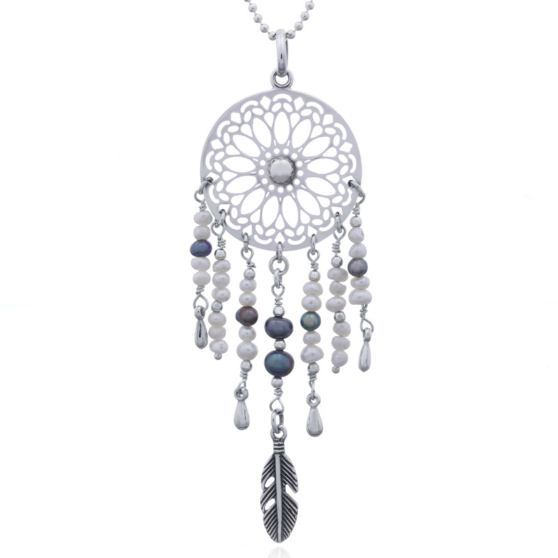 Dream Catcher Fresh Water Pearls Silver Pendant