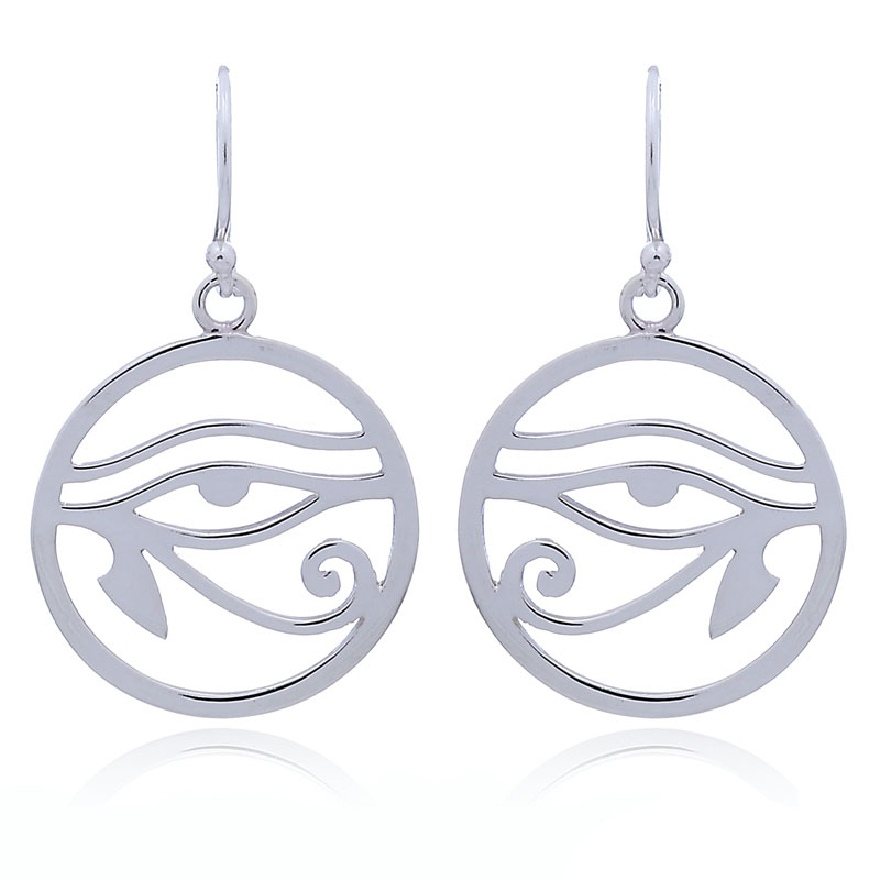 The round highly polished cut out of these Danglers display the Eye of Horus (Ra) which originates from Egyptian mythology. Crafted artfully of Sterling Silver delicate lines create the fine ornamental silversmith work that produces these shiny earrings They will certainly add some of their magic to the wearer as it is said that these Danglers ensure safety and health and also provide wisdom and prosperity.