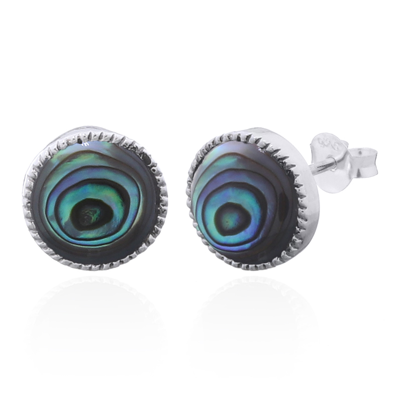 These stud earrings feature circular-shaped abalone shells set in smooth, serrated-edge 925 sterling silver bezels. Their sophisticated design offers retailers a unique blend of natural beauty and refined craftsmanship, perfect for customers seeking timeless statement pieces.