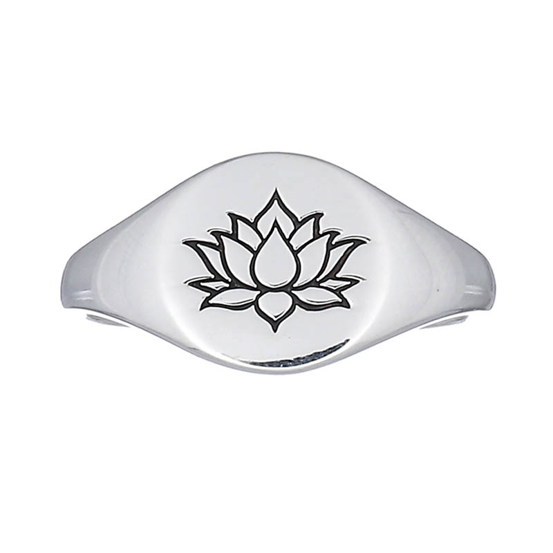 Plain silver rings have round shape on top and engraved flower on it that’s Lotus ( which featured the purity ).