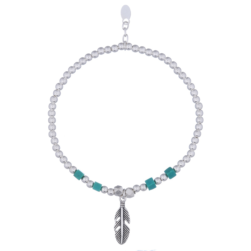 Chic style stretchable feather bracelet adorned with small cubes of Turquoise beads. Best to wear when stacked with different bracelets.