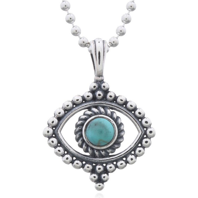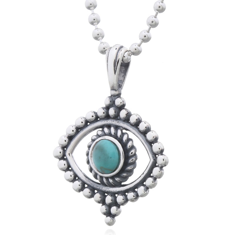 A striking evil eye pendant featuring a green stone, perfect for those drawn to symbolism and unique designs. Retailers can appeal to customers looking for meaningful jewelry that combines style with cultural significance.