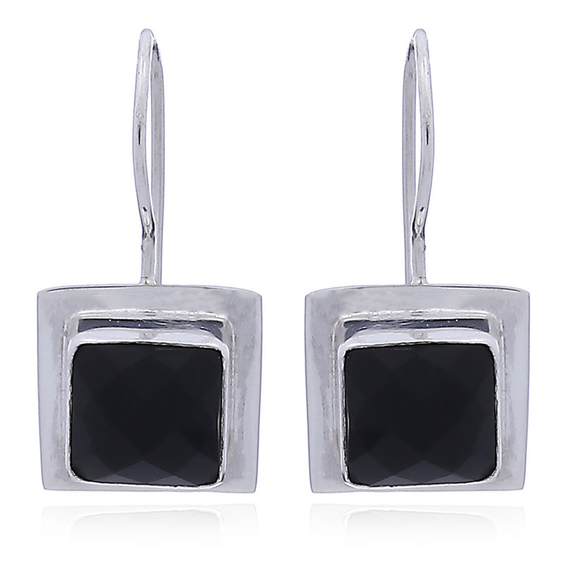 The grand flange surrounding the square cut faceted Black Agate creates a stunning contrast to the shiny facets of the fine gemstones. These are highly fashionable Drop earrings with a good portion of sophistication and an elegant flair. On fixed hooks handmade and fashioned in Sterling Silver these earrings can take a woman anywhere – always looking attractive and up to date.