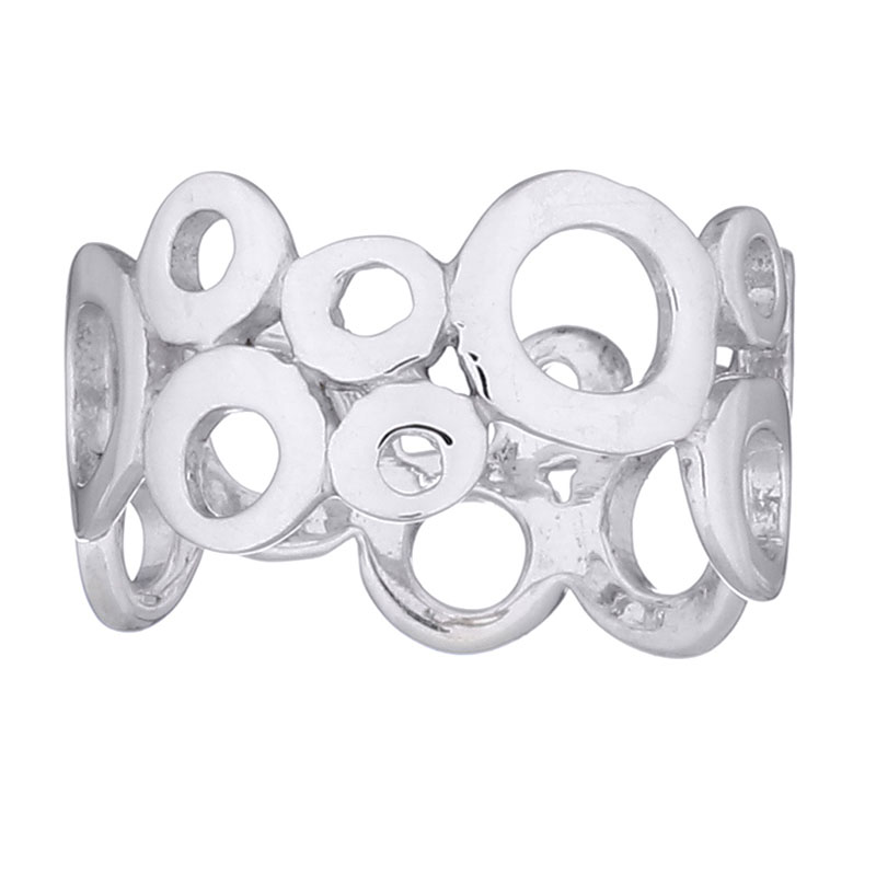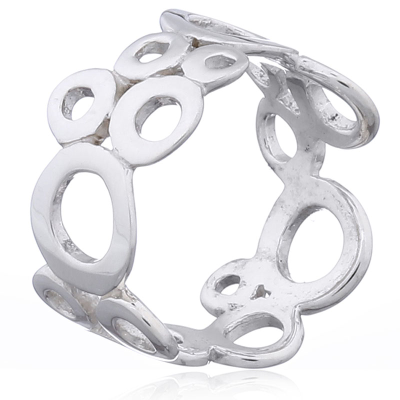 Various sizes of donuts create the entire band of this playful 925 silver ring that has a playful vibe to it. This Unique Planet Silver designer ring is fun but also stylish and popular. The shiny irregular sized donuts give it a fashionable appearance.