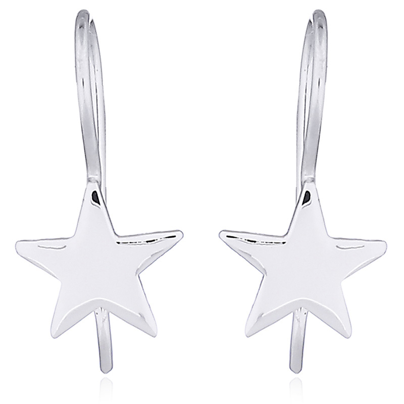 Relatively long round Sterling Silver wires attach to the top point of a finely crafted stamped Silver star to create a pair of playful silver drop earrings suitable for all ages in particular teens or young adults.