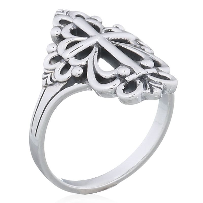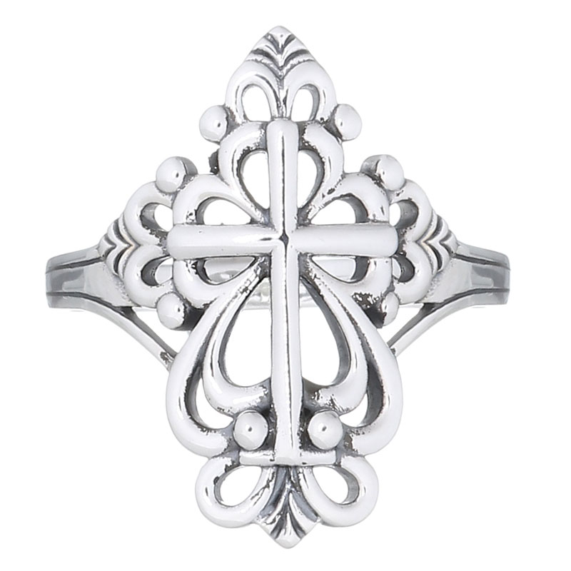 With a fleur de lis cross design, this silver ring combines elegance with classic symbolism. Retailers can attract customers looking for unique pieces that celebrate their heritage and personal style.