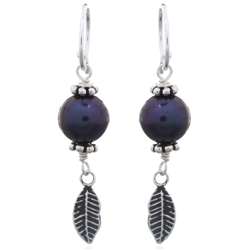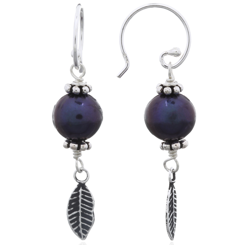 Inspired in nature this pair of silver dangle earrings feature lustrous 8mm Freshwater pearls embellished with floral ornaments on top and bottom created by antiqued silver spheres. At the bottom of each pearl an antiqued Silver feather is attached to a hoop allowing it to dangle freely. Sterling Silver dangle earrings equipped with almost completely circular silver hooks.