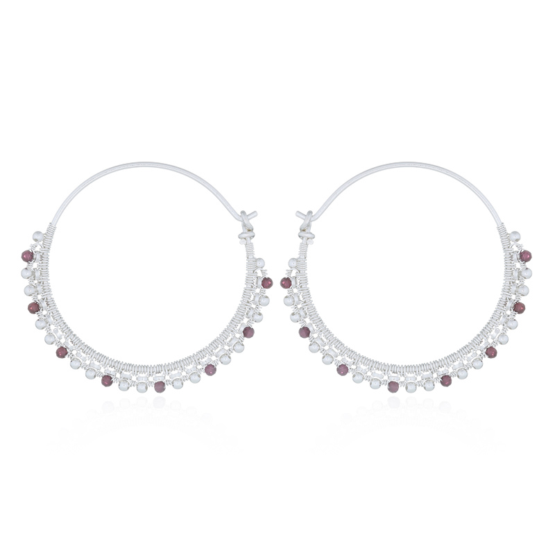 Infuse your collection with the vibrant combination of garnet stones and playful spheres in these threaded silver hoop earrings. Their striking design appeals to customers looking for unique and eye-catching jewelry.