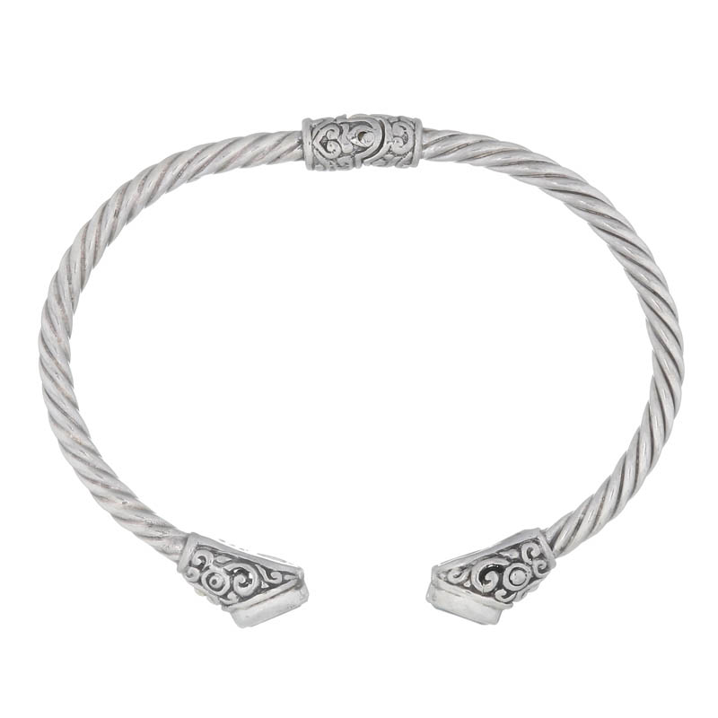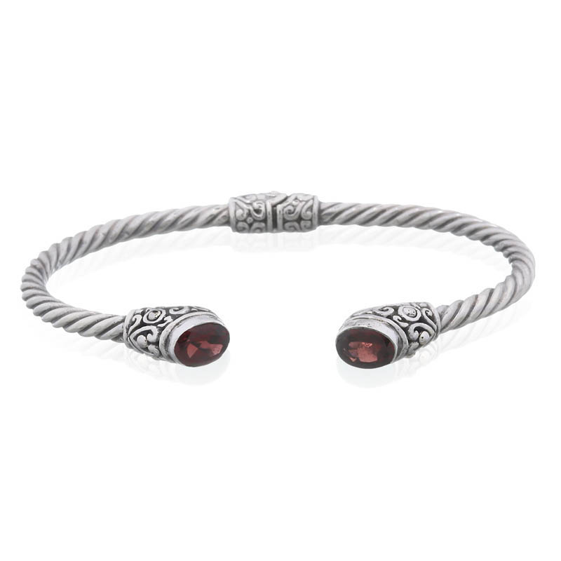 Featuring rich garnet stones, this hinged Bohemian bangle in sterling silver adds a touch of vintage charm. Retailers can market it as a bold, meaningful piece symbolizing love and passion.