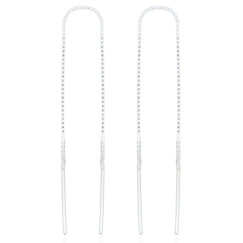 On both ends of the delicate box chain a wire is connected to make threading comfortable of this generously long Sterling Silver Threader earrings. Unobtrusive earrings yet eye-catching when the light is caught on the surface of the chain. Just a hint of a silvery shine flanks the features of a woman. Popular and young! Adjustable in length by threading the chain to the desired length at front or can be threaded through more than one pierced hole.