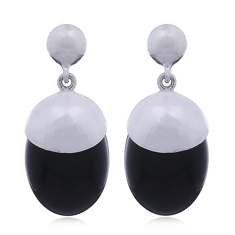 The glossy black gemstones creating these pair of Ear Studs are magnificently oval cut and polished clasped in bright shiny silver caps and flexibly connected to the bail of the semi-spheres of the stud post fastenings. These Black Agate earrings are very appealing and show the popular dangle. The created contrast between the Black Agate gemstone and the precious Sterling Silver adds elegance and is a perfect match for successful all occasions Stud earrings.