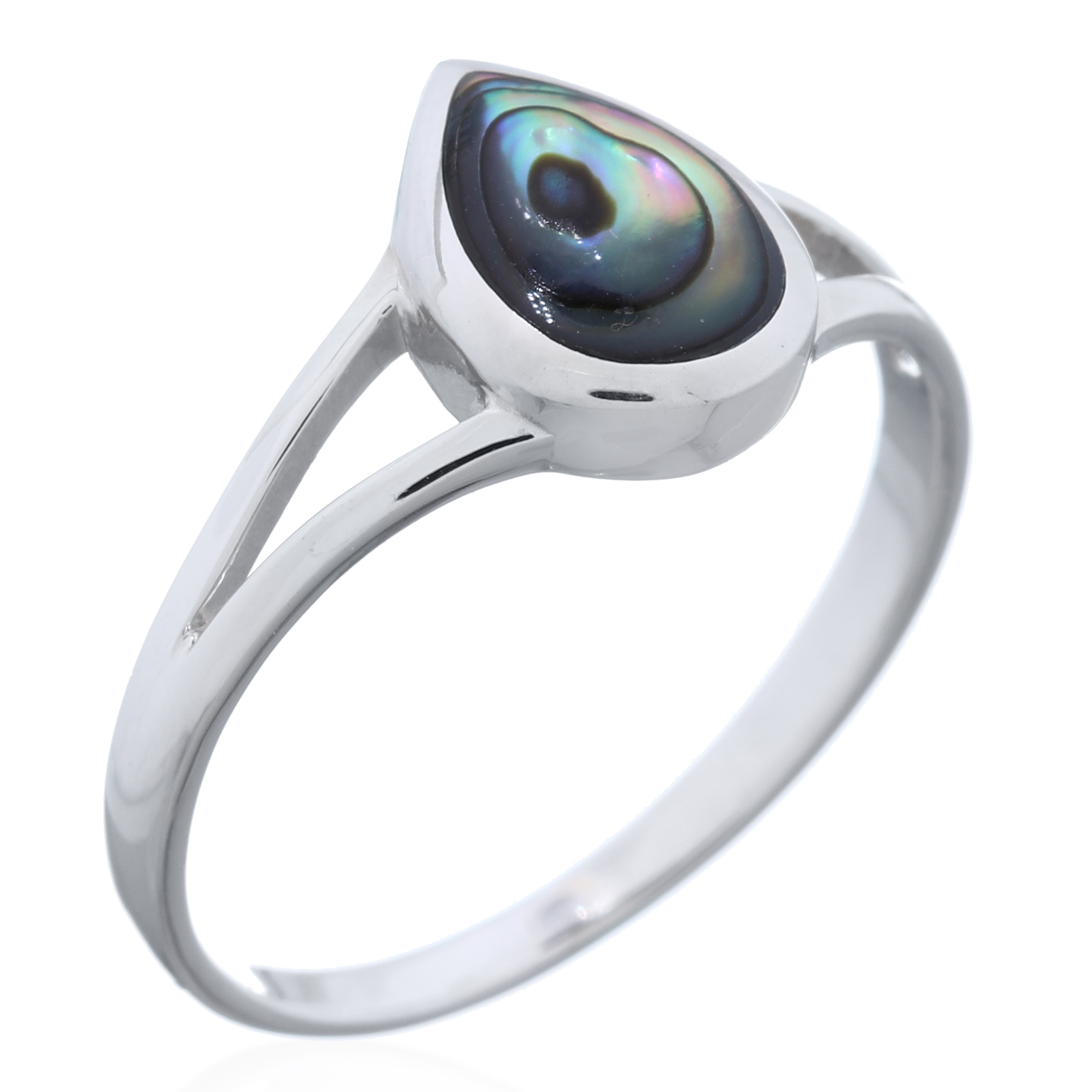 This elegant 925 sterling silver ring features a raindrop-shaped abalone shell inlay secured in a bezel setting, complemented by a stylish split shank band. Retailers will find it perfect for customers seeking delicate, nature-inspired jewelry with modern flair.