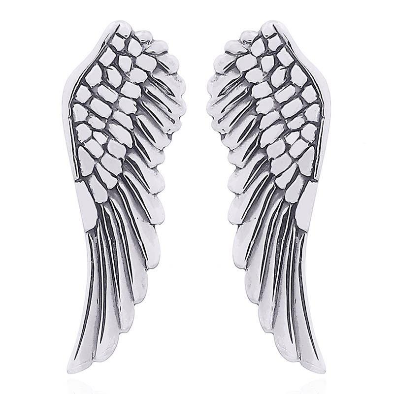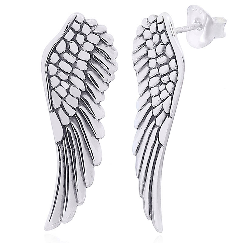 Beautiful angel wing stud earrings made in sterling silver show a graceful shape of outstretched feathers. Angel jewelry is special because is a symbol of protection and happiness. 925 silver angel wing stud earrings with smooth highly polished surfaces and antiqued recesses that are necessary to delimit he individual feathers.