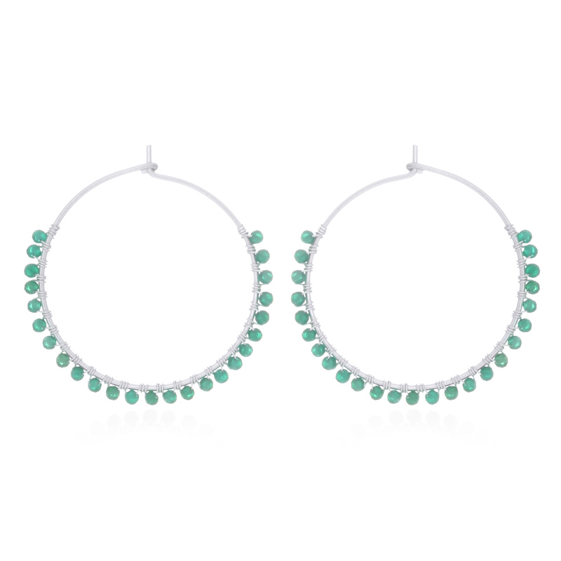 These circle wire hoop earrings, accented with lush green agate stones, offer a vibrant touch to any jewelry collection. Their unique design and lively color make them perfect for customers looking for bold statement pieces.