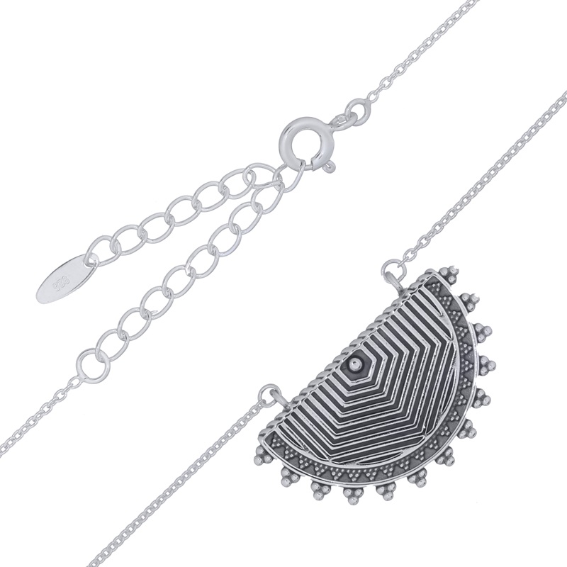 Featuring a half-moon tribal design in sterling silver, this boho necklace adds a touch of ethnic charm. A great choice for expanding your product line. Enjoy our factory pricing.