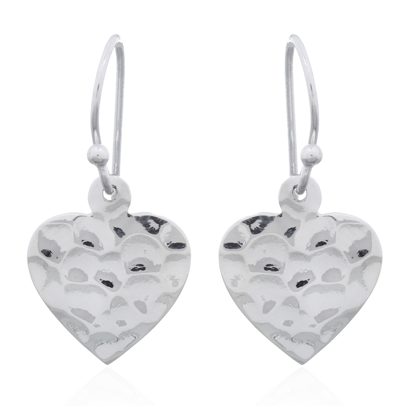 Round Silver wires create the hooks that make this beautiful pair of heart dangle earrings stay in place dangling from the earlobes. At the lower end of each hook a tiny loop provides the perfect place to attach each of the beautifully hammered Sterling Silver hearts each perfectly polished.