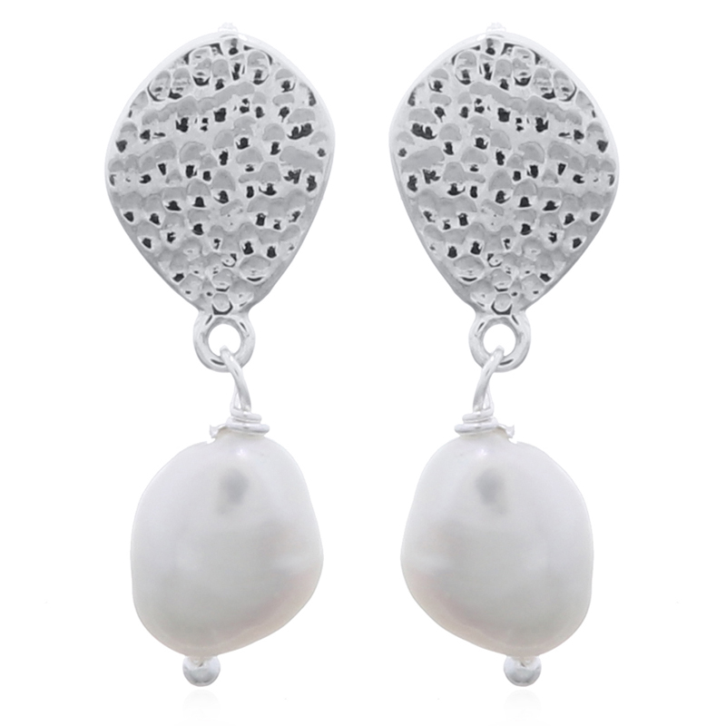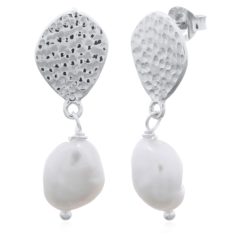 Hammered Pebble-Shaped 925 Silver Studs With Hanging Pearl