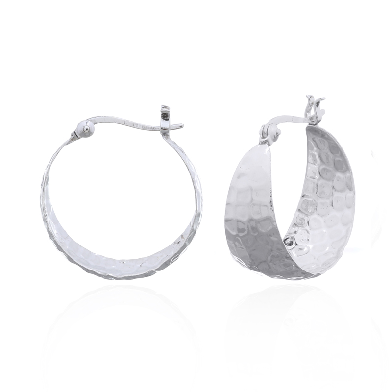 Hammered plain 925 Sterling Silver convex Hoop earrings add a tasteful and classic style to the looks with their gorgeous gradually tapering shapes that surround the earlobe with a spectacular sparkle and shine. The light breaks on the hammered surface delightfully adding a charming rich feature to these elegant silver hoop earrings. This is timeless plain silver jewelry that will still be beautiful in many years from now.