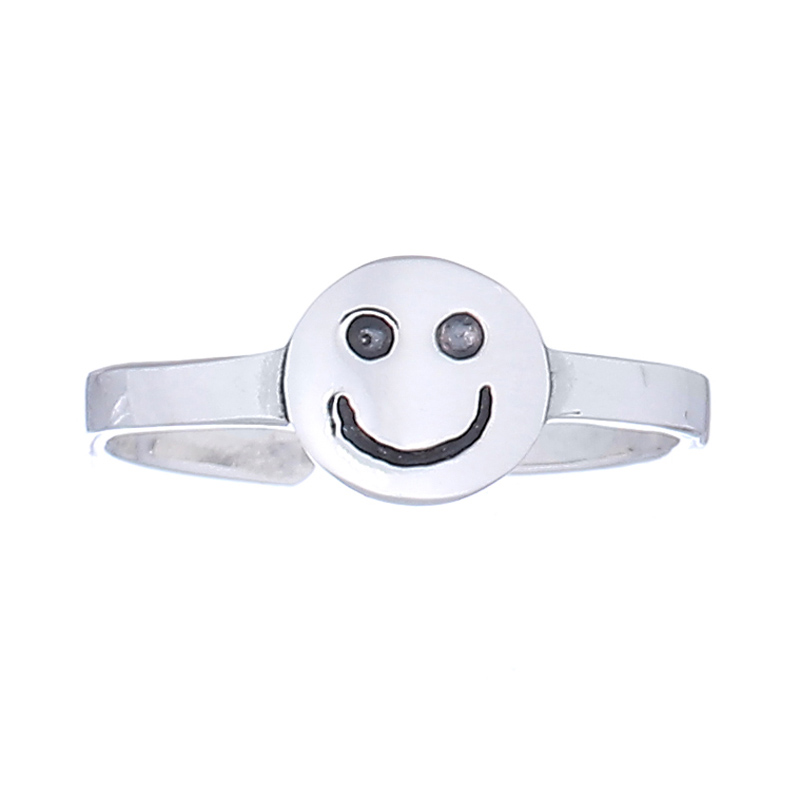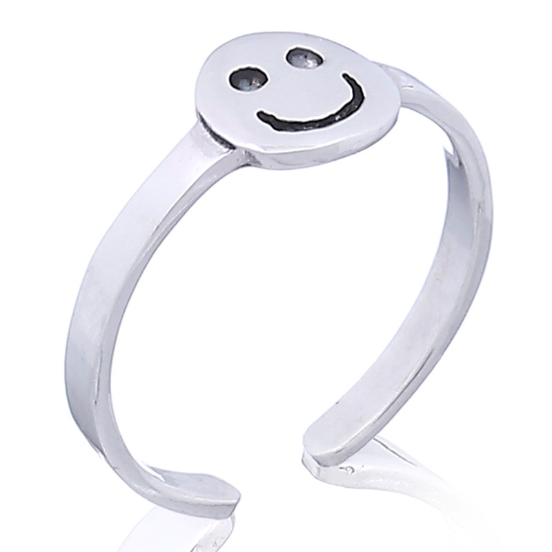Sterling Silver happy face toe ring displays the iconic symbol with its recessed antiqued lines creating the eyes and mouth. A highly polished and adjustable silver band accompanies the happy face or smiley.