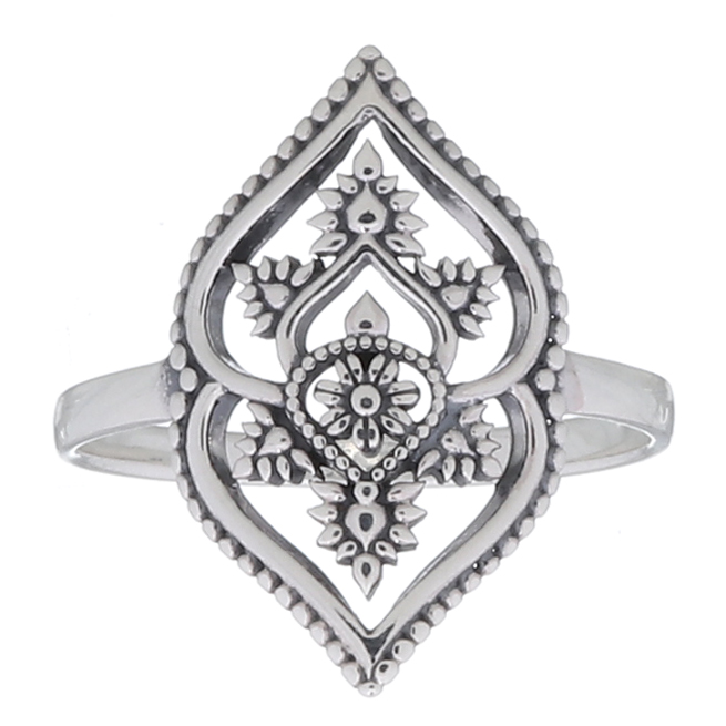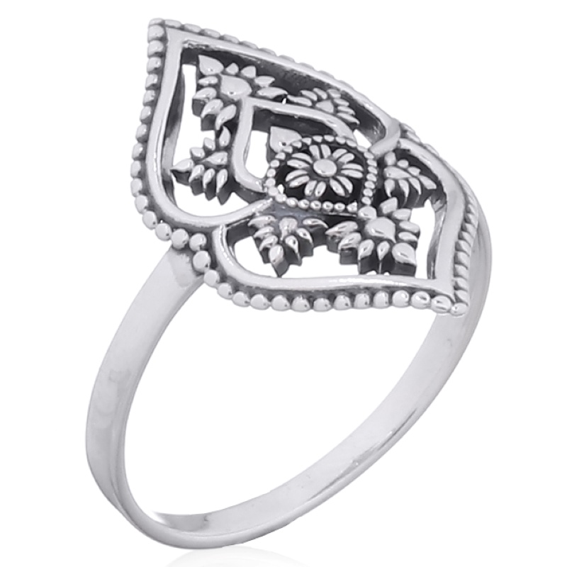 This antiqued ring showcases henna flower petals, delivering a vintage appeal that customers will adore. Its rich detailing makes it an ideal choice for retailers looking to enhance their inventory with unique, culturally inspired pieces.