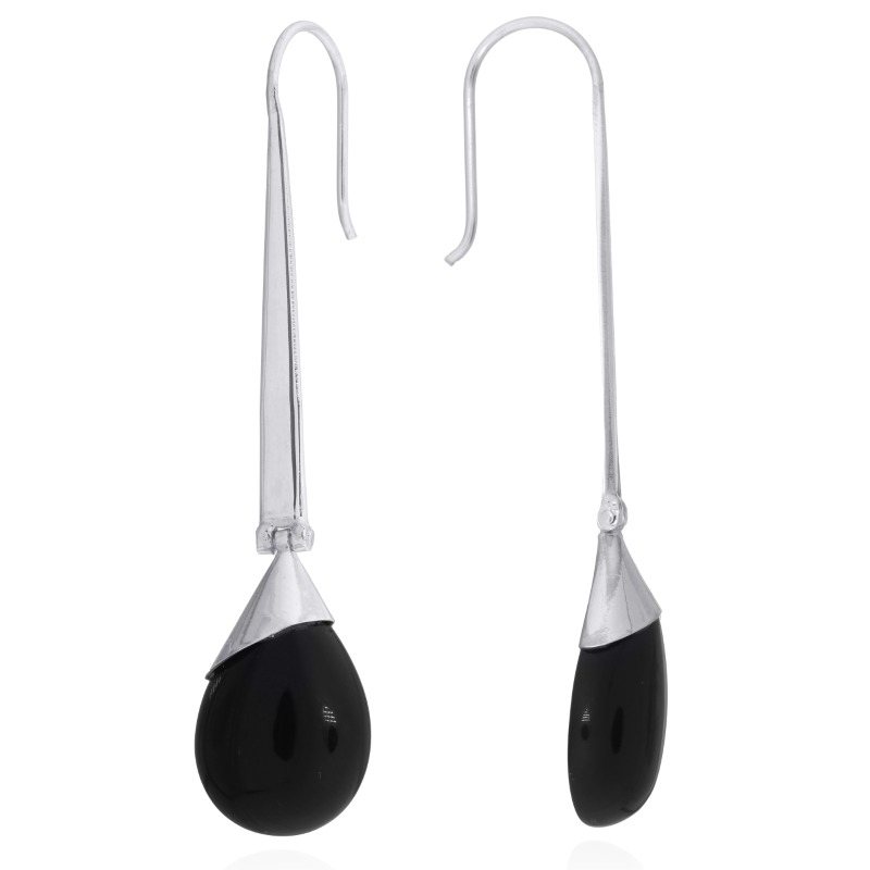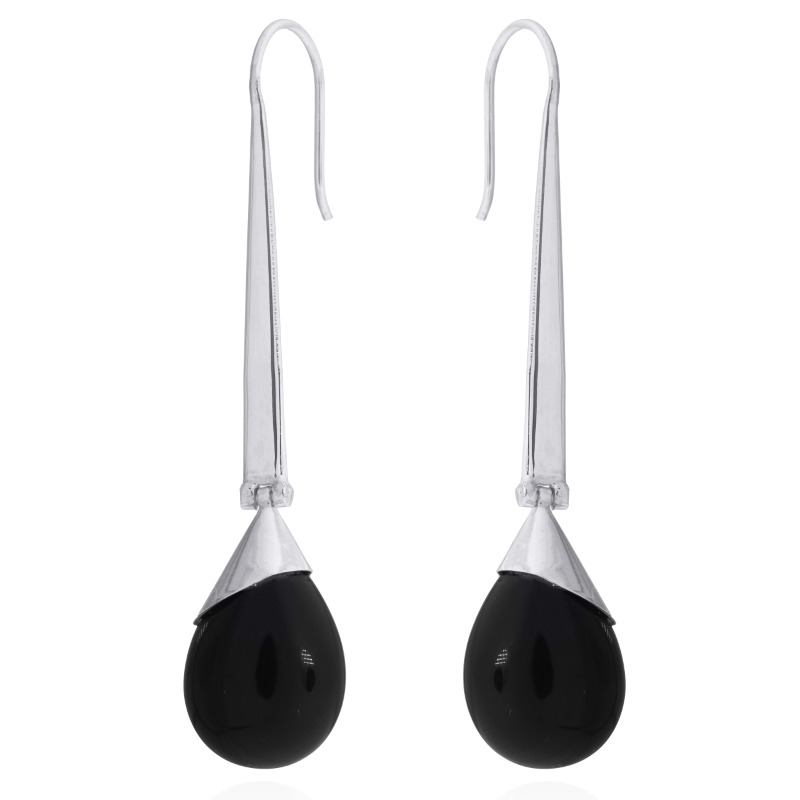 Stunning Sterling Silver stick hanger Drop earrings present their hinged pear cut glossy Black Agate cabochons clasped in highly polished asymmetrical silver caps. Adorable young earrings design that add extra style to a pretty look with an high-end fashion feel. These earrings flank the features with silvery shine and the fine sheen of the contrasting gemstones.