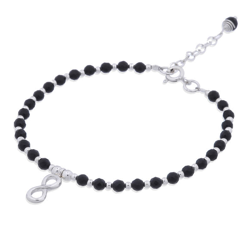 Faceted Black Agate beads and round Silver beads are threaded one after the other to create a bracelet of contrasting colors. A silver polished infinity symbol charm hangs from the bracelet surrounded by slightly larger silver beads. With a 3 cm chain hanging from the springing clasp the user can adjust the length of the bracelet. Dimensions of infinity symbol 5 x 15 x 2 mm.