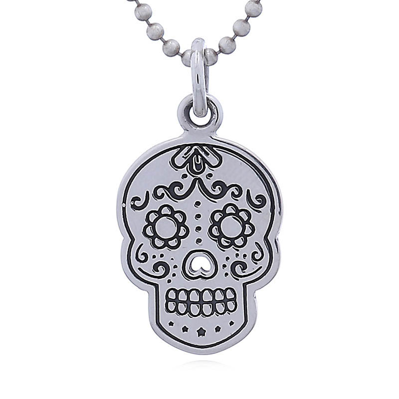Tiny black dots under and in between its eye sockets as well as under its teeth are part of an intricate design of darkened grooves that decorate this Mexican-inspired sugar skull pendant.