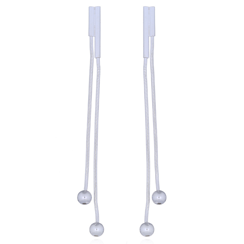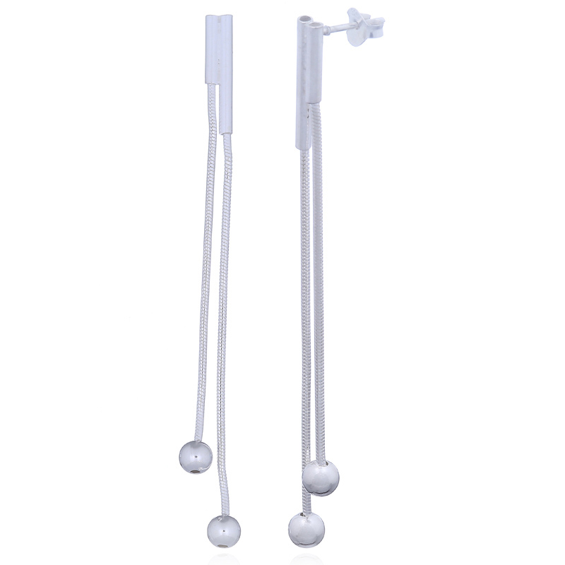 Long 925 Sterling Silver Stud earrings flank the features with a charming and delicate silver jewelry that stages each two balls on a snake chain that drops from the two asymmetrical cylindrical posts that vary in height. High fashion Sterling Silver jewelry that flatters a woman with a gracious style that looks stunning with short hair or an up-do exposing fully the alluring silver shine generated on the convex silver balls and slick snake chains