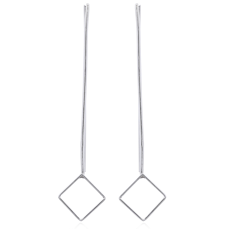 An open sterling silver square joins at a corner to long polished silver sticks that bend at right angles. A geometric jewelry design that is basic yet beautiful for their finish and quality.