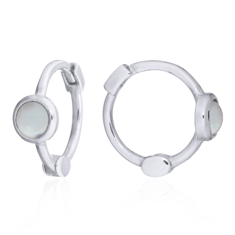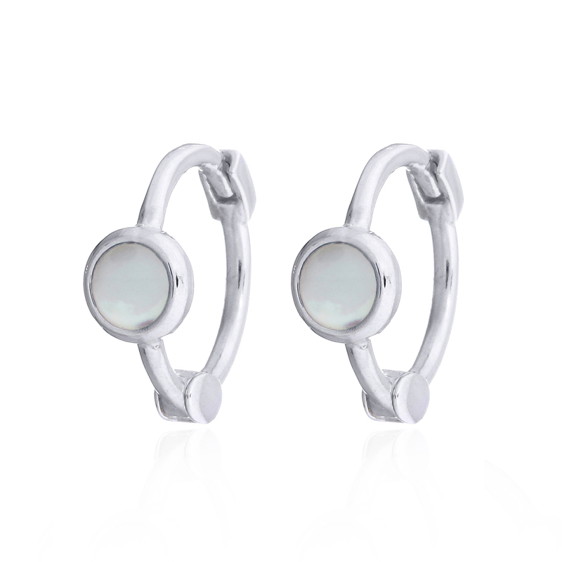 These charming huggie earrings are crafted from 925 sterling silver and showcase a circle of Mother of Pearl inlay. The secure, hinged closure ensures comfort and style. Luminous elegance perfect for retail sourcing.