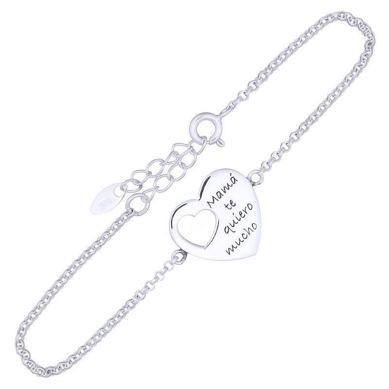 A heart charm sterling silver bracelet with engraved “Mama Te Quiero Mucho” message which means “I love you” Mom in Spanish.