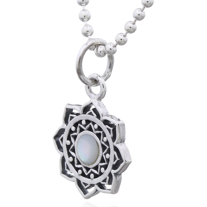 Featuring a mandala flower design, this pendant is enhanced by the iridescence of mother of pearl. Its intricate details and soothing aesthetic attract customers who appreciate unique artistry. A stunning addition that embodies beauty and tranquility in any jewelry collection.