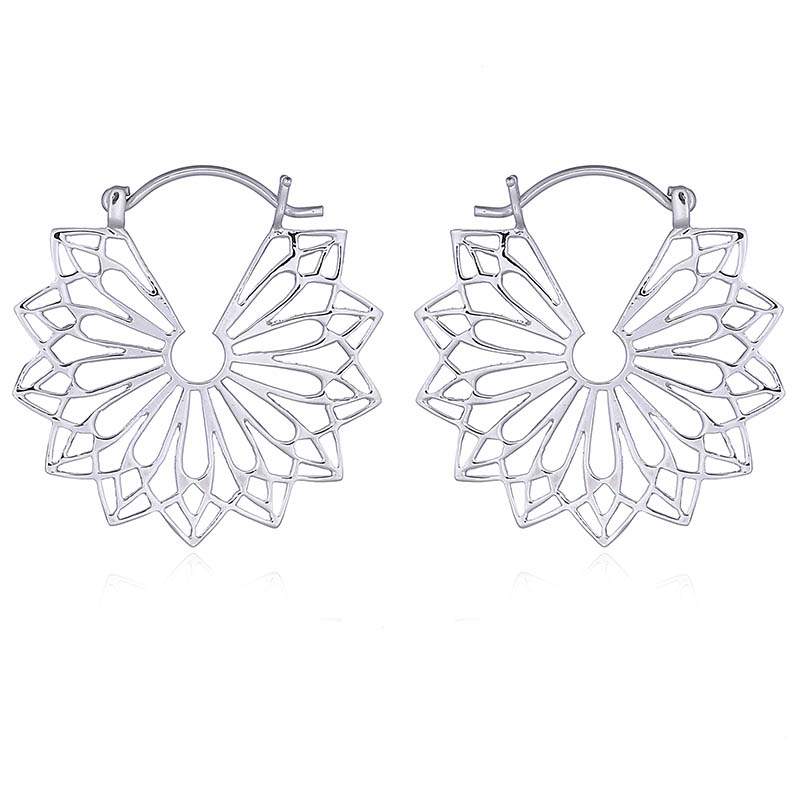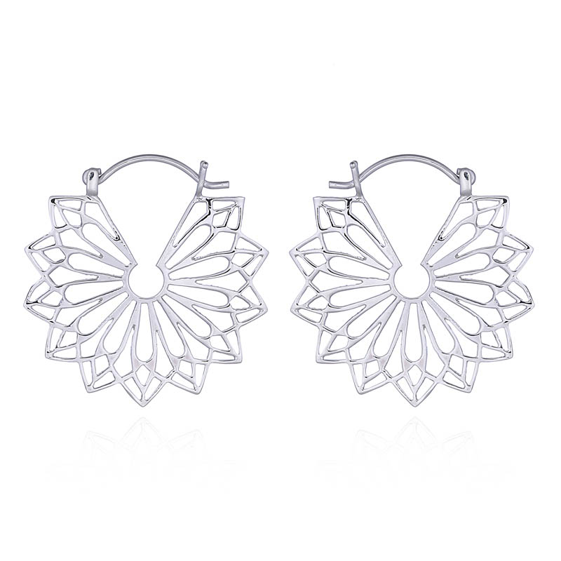 The mandala us a geometric figure representing the universe in Hindu symbolism. The beautiful symmetric pattern created by thin silver lines radiates outwards from the open center in this well-made pair of silver hoop earrings. The lines interconnect near the perimeter of the pattern in to a hypnotizing arrangement.