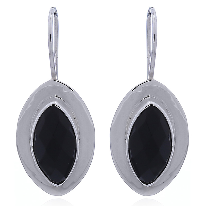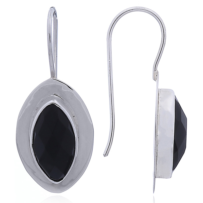 The marquise cut faceted Black Agate gemstone reflects stunningly the light on the diamond shaped facets. Surrounded by a generous sized high polish finish Sterling Silver flange that follows the shape of the Black Agate creates classy and sophisticated Drop earrings with a very own and distinguished look. On fixed hooks and handmade these earrings are eye-catching stunners.