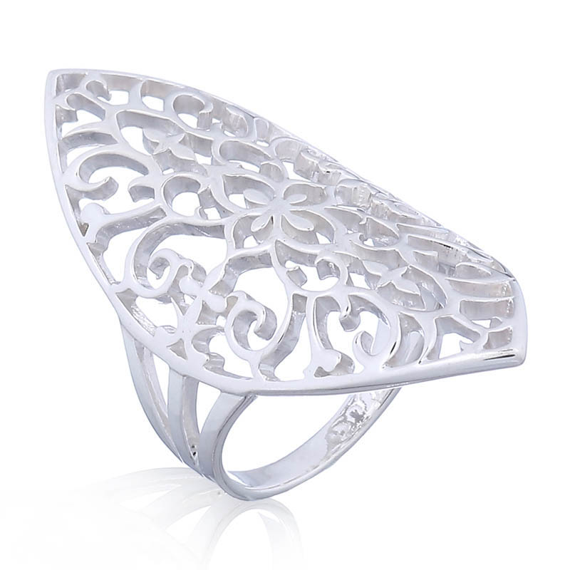Elongated marquise shape ring with symmetrical floral pattern.