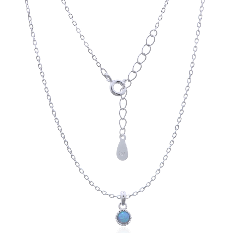 This mini round blue opal necklace showcases a burst of color in a subtle form, ideal for enhancing retail displays with a touch of elegance and capturing customers’ interest with its captivating sparkle.