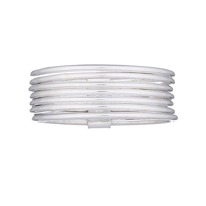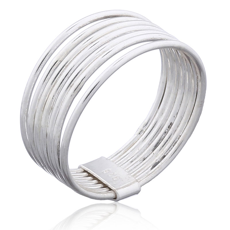 This simple yet elegant wire ring is handmade with polished round sterling silver wire. In turn the wire was used to create seven individual hoops united at the bottom via a silver plate holder. Multi-band ring available in the most common sizes.