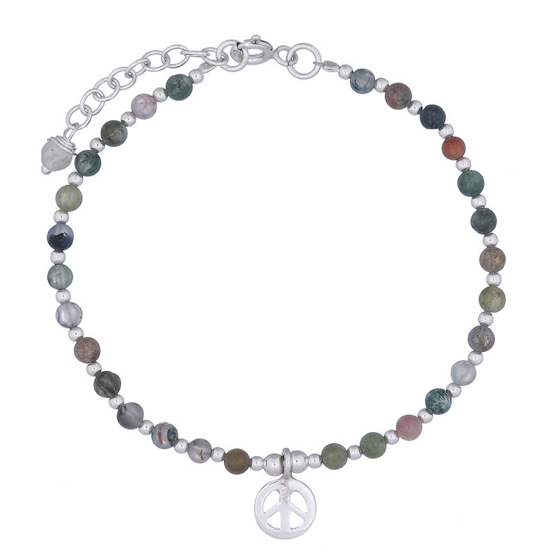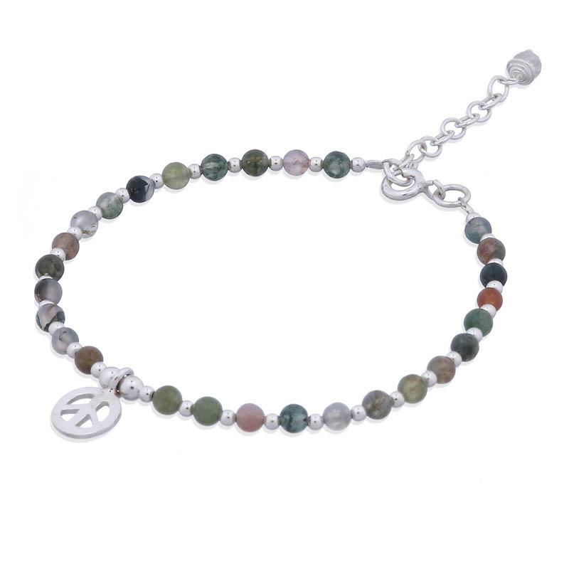 Round Grass Agate and multicolored Agate beads of 3 mm in diameter adorn this very good-looking Planet Silver beaded gemstone bracelet. A highly polished peace symbol charm hangs from the bracelet surrounded by 4 silver beads; the beads are also found alternating with each Agate bead. Adjustable bracelet up to and extra length of 3 cm by the use of a chain at the spring clasp. (Peace charm dimensions 8 x 12 x 1 mm).