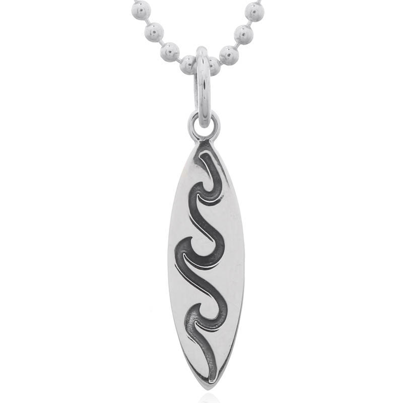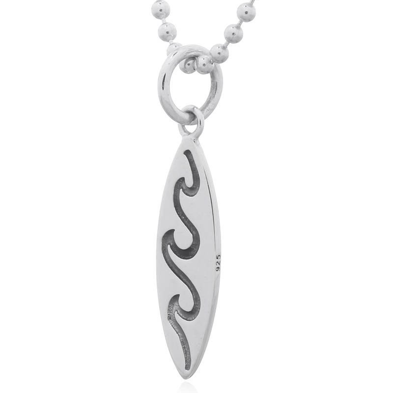 This sterling silver surfboard pendant with an ocean wave design captures the adventurous spirit of the sea, ideal for retailers catering to ocean lovers and surfers.