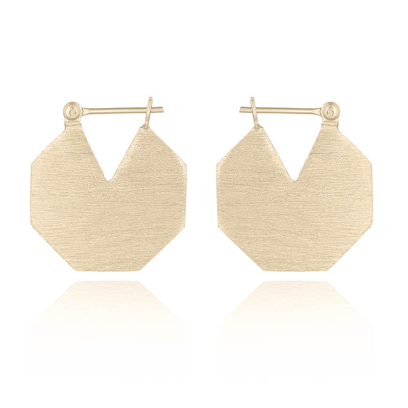 Solid flat disc octagon brushed finished yellow gold plated hoop earrings.