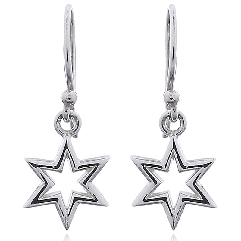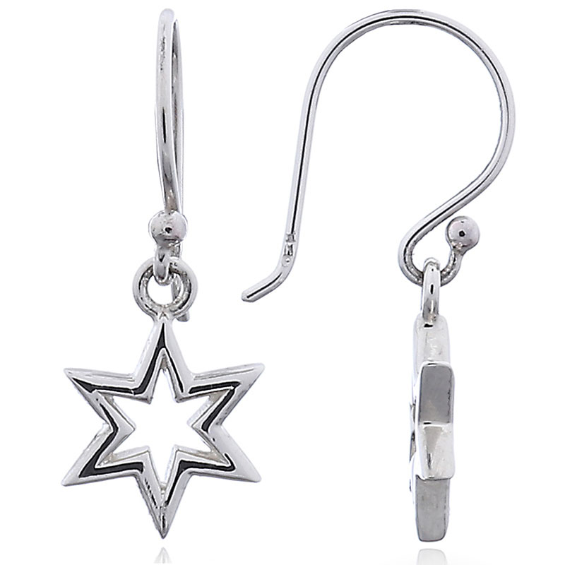 Open star earrings made in sterling silver show each star with perfectly symmetrical shapes and 6 points. Engaging pair silver earrings whose highly polished silver brings out the beautiful luster of the metal. These star dangle earrings are for women of all ages but in particular will go well with teenagers and adults.
