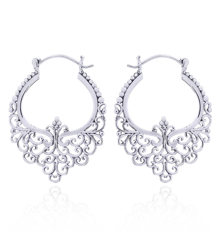 Gypsy silver hoops made in 925 silver display an exquisite symmetric pattern of fine silver lines and dots. The multiple twirls sack upon each other spreading outwards where they finally meet rows of dots that climb up until they meat the lever closure of atop these hoop earrings.