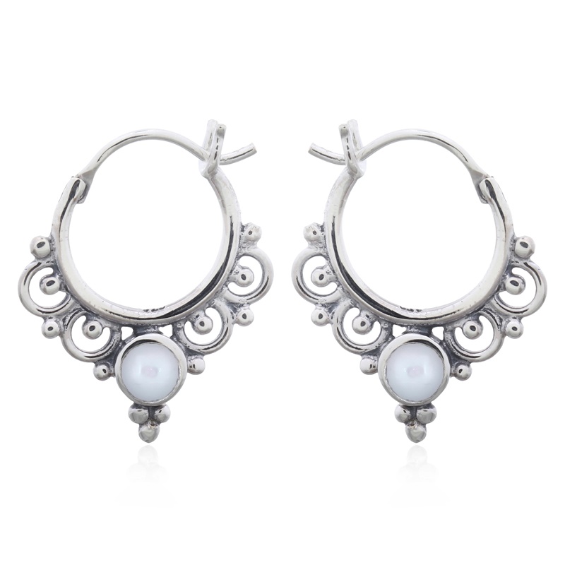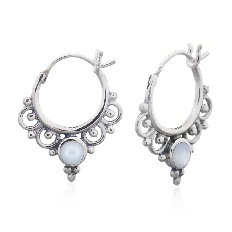 Featuring ornamented boho design with mother of pearl stones, these hoop earrings in 925 silver offer a unique and stylish accessory. Perfect for enhancing your collection. Enjoy our factory pricing.