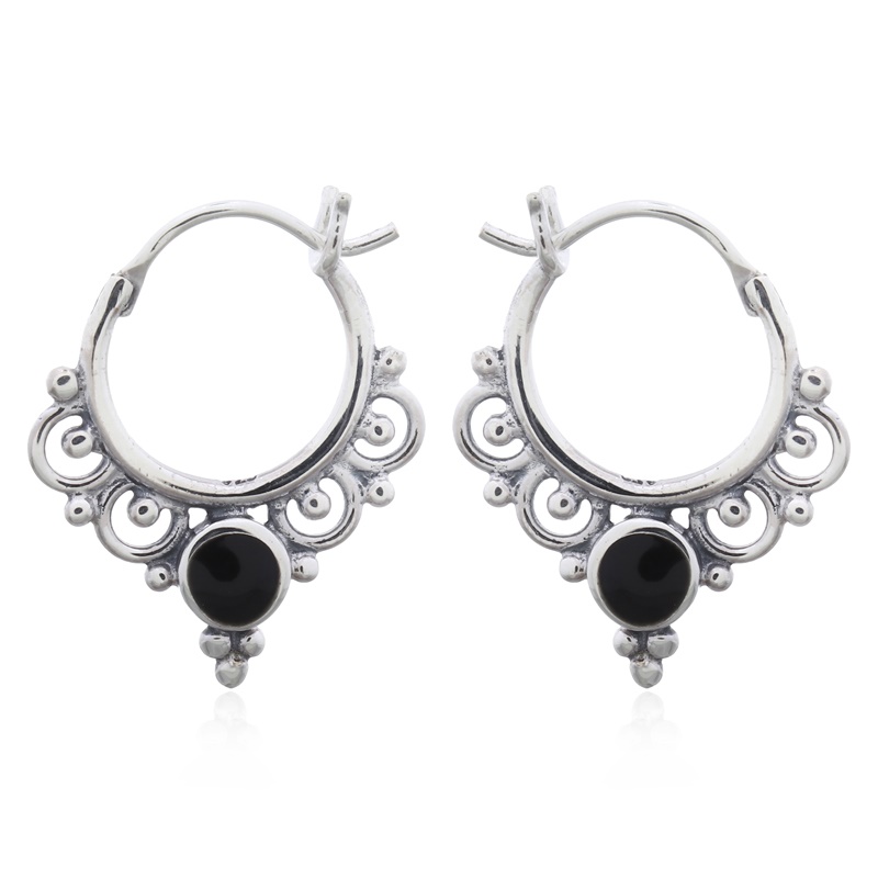 Ornamented boho hoop earrings with synthetic black stones in 925 silver add a touch of bohemian charm to any collection. Ideal for expanding your inventory. Benefit from our factory pricing.