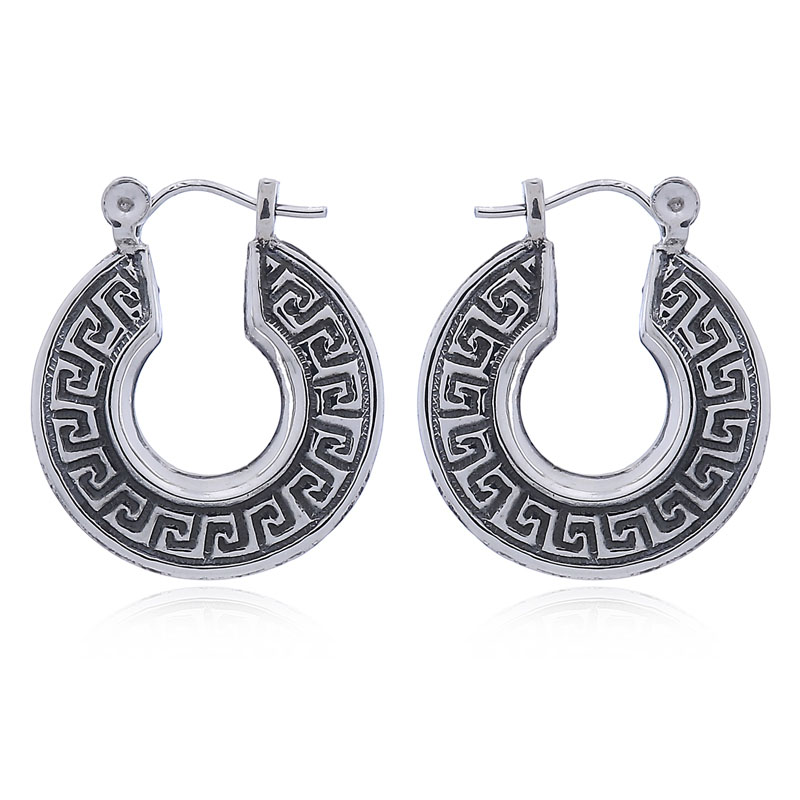 Beautifully embellished with the embossed geometric line pattern that dates back to ancient times and slightly convex towards the center these Hoop earrings are spectacularly elegant. Made with Sterling Silver and exquisitely designed the earrings are completed with an elegant bevel and secured with a fastening for the fine hinged hook. These Hoops will most likely be one of the favorites in a woman’s jewelry box as these earrings look so stylish and elegant when putting them on.