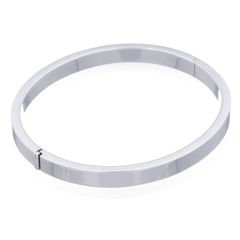 Oval hollow sterling silver bangle features a hinge and a box clasp for ease of wear. The clasp is almost completely hidden inside the rectangular-shaped body of the bracelet and the hinge is of a minimal design achieving a streamlined lean look.