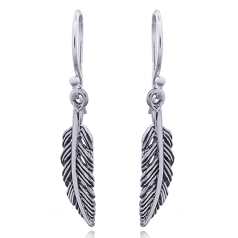 Inspired by nature’s creations these 925 silver feather danglers show small openings between the lines that represent the feather barbs. A careful oxidation in just the right places adds an element of realism. Comfortable every day wear dangle earrings in sterling silver made following strict quality standards.