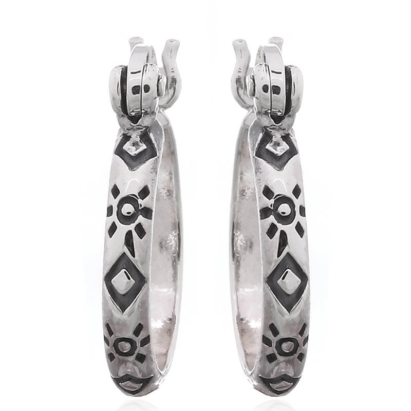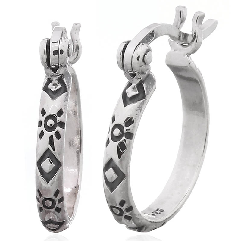 Capture the essence of timeless design with these striking hoops. The oxidized sun and rhombus pattern creates a captivating visual appeal, making them a standout piece in any collection. Their quality craftsmanship ensures durability, making them a favorite among customers.