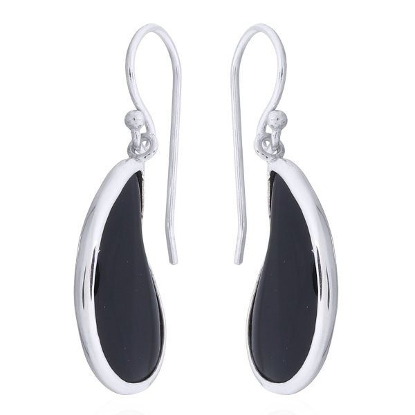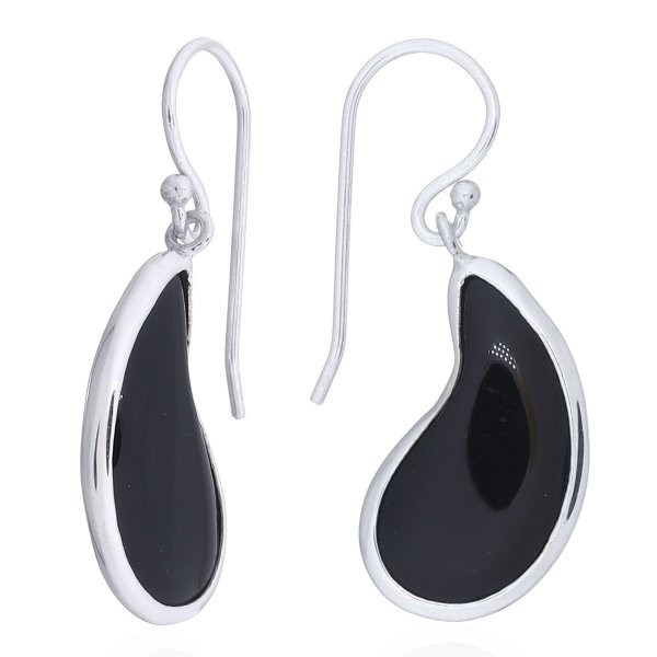 The popular floral design of paisley comes here as a silhouette created of a strikingly beautiful Black Agate cabochon that convinces with its glossy surface and slick look. This is a pair of “want to have” Dangle earrings with hooks that are unobtrusive yet outstanding and satisfy the taste of women that are actively participating in modern society. Deep set in shiny polished 925 silver these earrings add a chic flair.